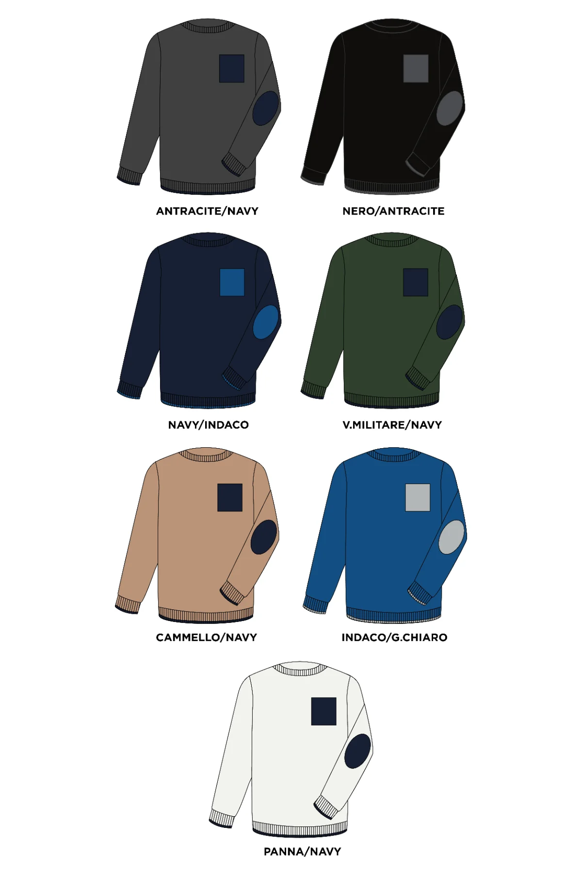 | Colore | ANTRACITE/NAVY, CAMMELLO/NAVY, INDACO/GRIGIO CHIARO, NAVY/INDACO, NERO-ANTRACITE, PANNA/NAVY, V.MILITARE/NAVY |