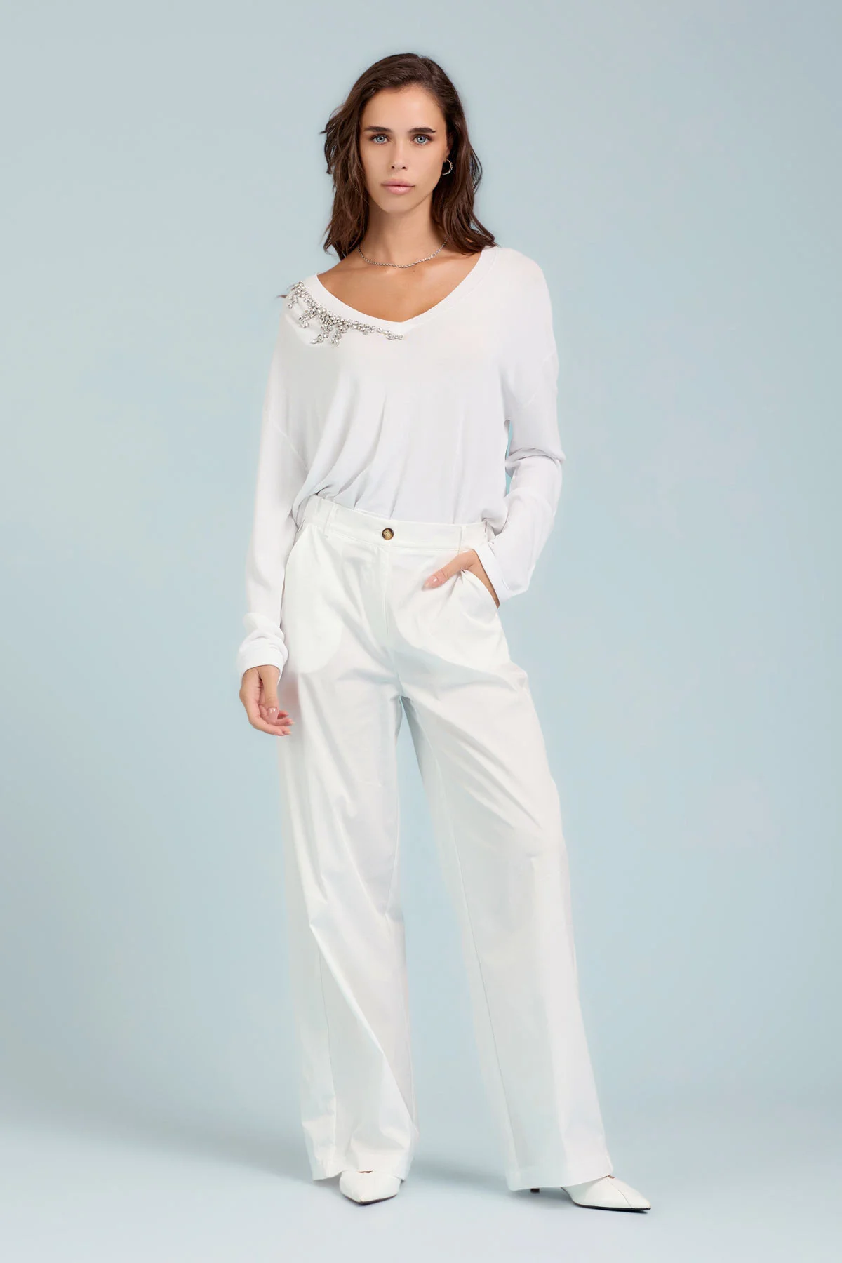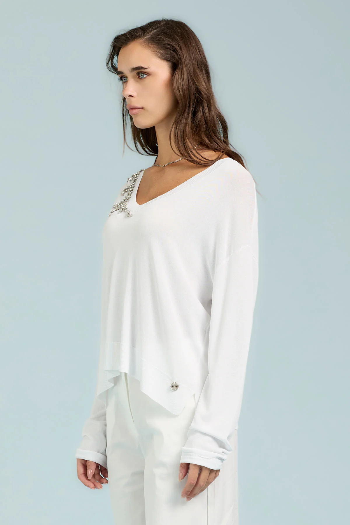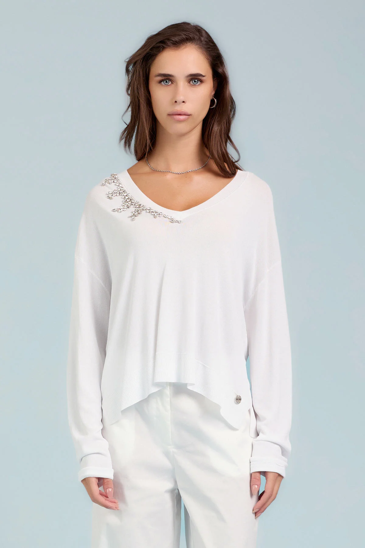 SCOLLO A V CON APPLICAZIONI GIOIELLO SU SPALLA – DK04034